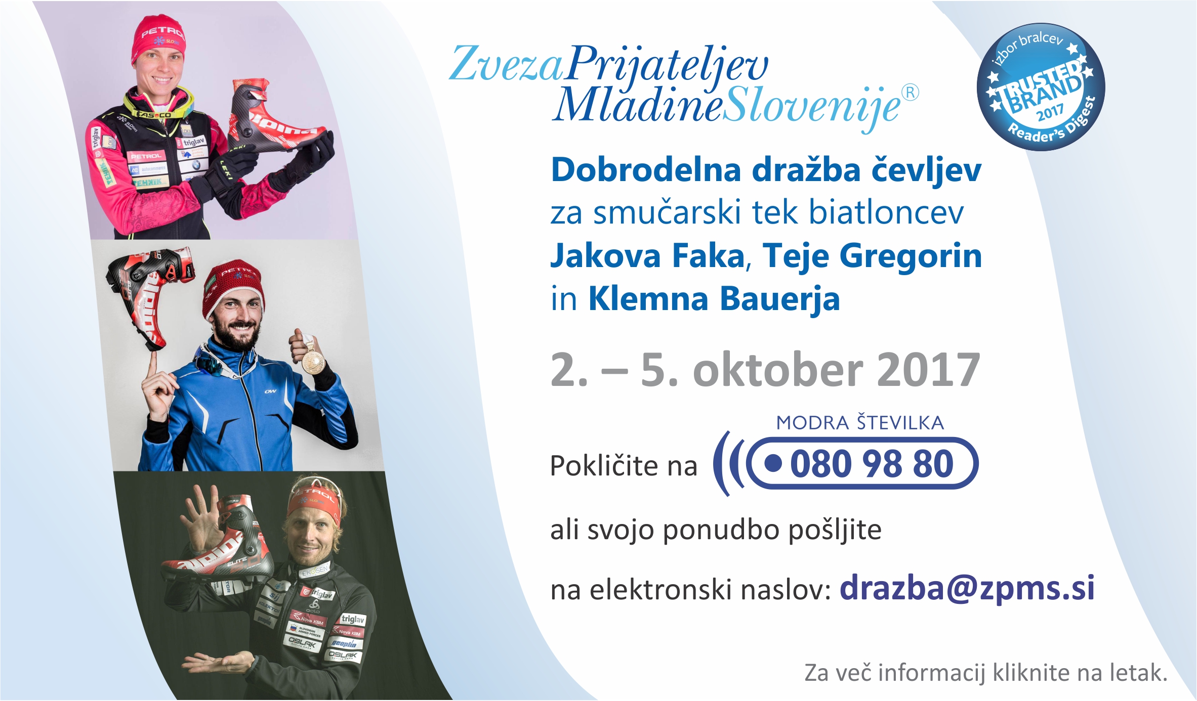 Biatlonci, ki na tekmovanjih zastopajo Slovenijo, Jakov Fak, Teja Gregorin in Klemen Bauer, so svoje podpisane čevlje za smučarski tek Alpina podarili Zvezi prijateljev mladine Slovenije. Mi pa vam jih ponujamo na dobrodelni dražbi. S sodelovanjem lahko poleg obdaritve sebe ali vaših bližnjih osrečite tudi tiste, ki imajo zaradi socialne stiske malo manj sreče. Ves izkupiček dobrodelne dražbe bo namenjen štipendijskemu skladu za mladostnike, ki jim starši, zaradi pomanjkanja finančnih sredstev, brezskrbnega nadaljnjega šolanja ne bi mogli omogočiti.