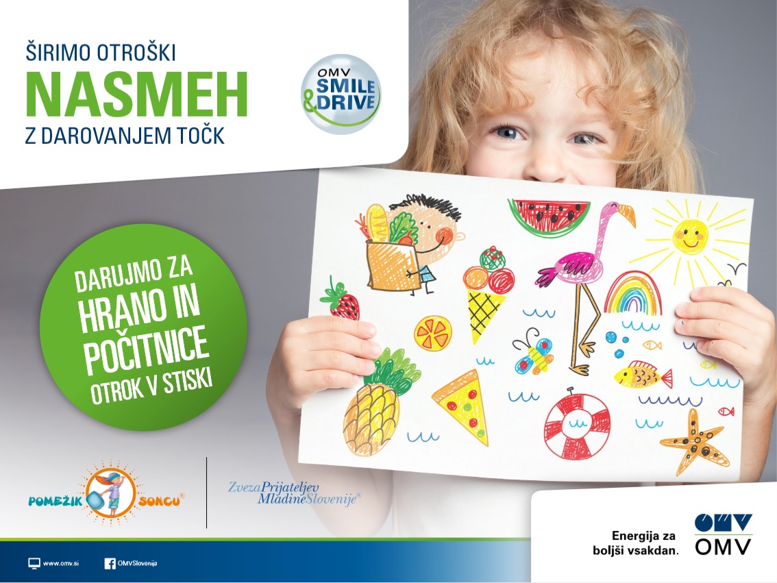 Zvesti partner humanitarnega programa Pomežik soncu® je tudi letos OMV Slovenija, ki s tem tradicionalno povezuje sedem let obstoja svojega Kluba zvestobe OMV SMILE & DRIVE. Tako bodo tudi letos z mislijo na najmlajše združili moči s svojimi člani kluba zvestobe ter od ponedeljka, 25. januarja, in vse do 28. februarja 2021, omogočili donacijo točk zvestobe, ki jih gostje prejmejo ob vsakem nakupu na servisu, v dobrodelen namen. Letos bo namen dvojen – en del bo na počitnice popeljal otroke, ki si jih sicer ne bi mogli privoščiti, drugi del sredstev pa bo namenjen bonom za hrano.