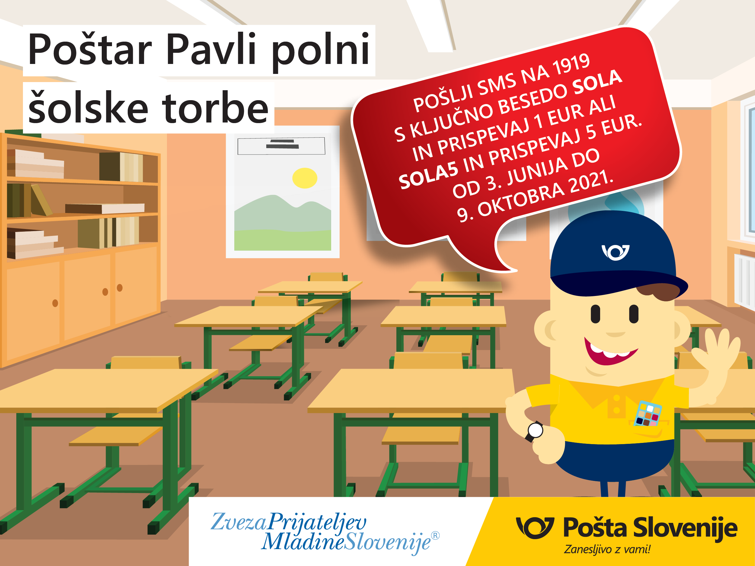 Pošta Slovenije tudi letos, že devetič po vrsti, pomaga z akcijo Poštar Pavli polni šolske torbe Zvezi prijateljev mladine Slovenije.