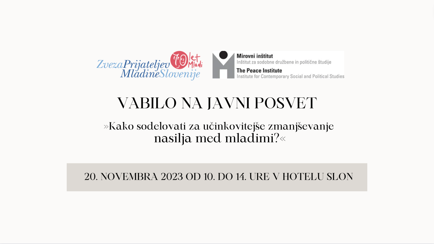 Mirovni inštitut v sodelovanju z Zvezo prijateljev mladine Slovenije vljudno vabi na posvet o ozaveščanju in zmanjševanju nasilja med mladimi.