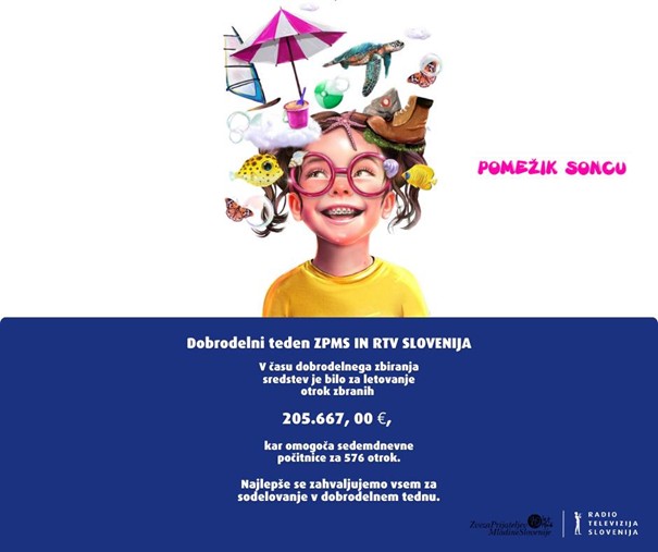 Ponovno so se oddaje TV Slovenija pridružile naši humanitarni akciji Pomežik soncu. V dobrodelnem tednu, ki je trajal od 19. do 25. maja, smo za letovanja otrok iz socialno šibkih okolij zbrali 205.667 evrov in tako sedemdnevno letovanje omogočili 576 otrokom.