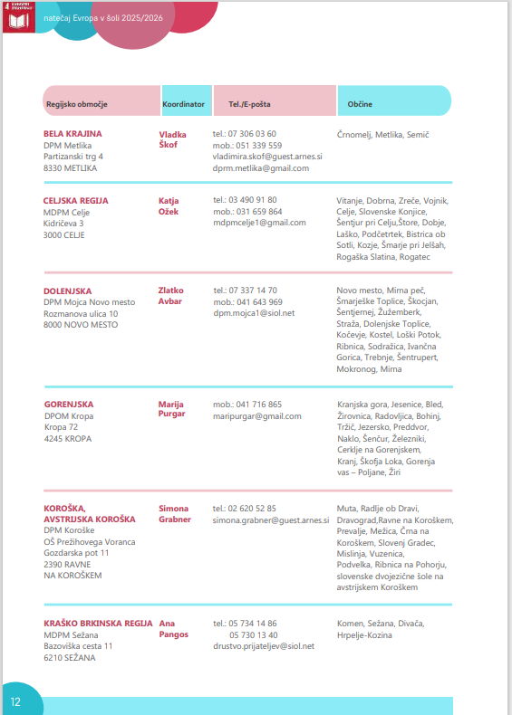📩 Prijavnice za sodelovanje oddajo šole in vrtci svojim regijskim koordinatorjem programa Evropa v šoli. Seznam regijskih koordinatorjev je objavljen v publikaciji: Evropa v šoli – Zveza prijateljev mladine Slovenije