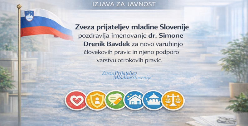 Zveza prijateljev mladine Slovenije (ZPMS) pozdravlja imenovanje dr. Simone Drenik Bavdek za novo varuhinjo človekovih pravic. Veseli nas, da funkcijo prevzema strokovnjakinja, ki razume pomen celostnega varovanja človekovih pravic ter posebej poudarja tudi potrebo po učinkovitem in sistemskem varstvu otrokovih pravic.