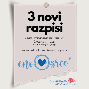 Dragi mladi prijatelji in podporniki, Veseli smo, da lahko obvestimo, da Zveza prijateljev mladine Slovenije (ZPMS) razpisuje tri nove razpise...