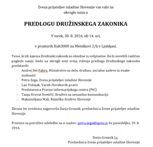 Zveza prijateljev mladine Slovenije vas vabi na okroglo mizo o predlogu Družinskega zakonika, ki bo v torek, 30. 8. 2016,...