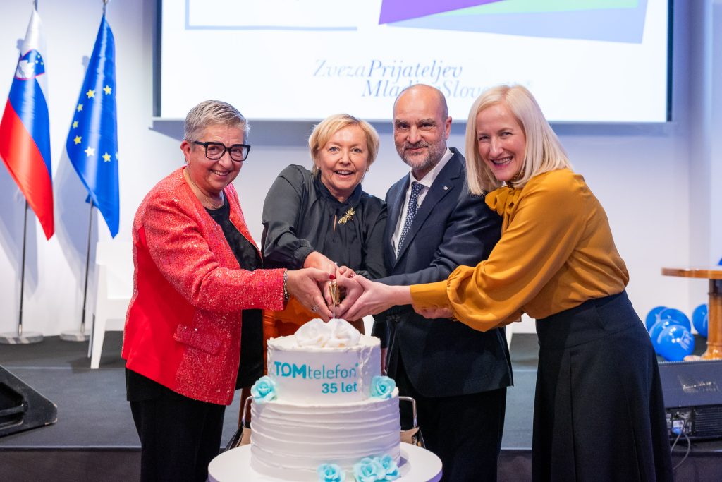V zaključnem delu dogodka so torto slavnostno razrezali Albert Mrgole, predsednik sveta Nacionalne mreže TOM telefon®, Breda Krašna, generalna sekretarka ZPMS, Darja Groznik, predsednica ZPMS in Tjaša Bertoncelj, strokovna vodja Nacionalne mreže TOM telefon®.